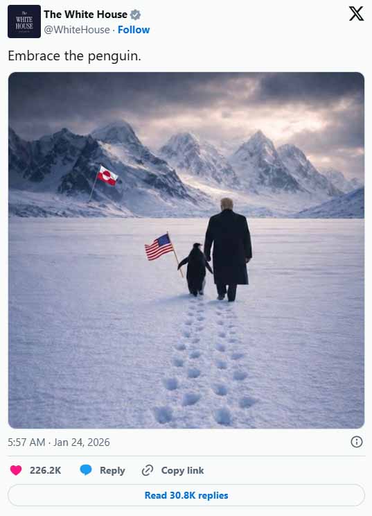 "虚无主义企鹅"迷因源于维尔纳·赫尔佐格2007年纪录片《在世界尽头相遇》中的感人场景,一只孤独的皇帝企鹅离开群体走向必死之地,近二十年来一直在网上流传,作为存在孤立或反叛个人主义的象征。白宫2026年1月24日的病毒式X帖子巧妙地重新利用了这个经典图像,描绘企鹅手持美国国旗,远处山脉背景中有格陵兰国旗,直接呼应了唐纳德·特 朗普总统长期以来对从丹麦收购格陵兰的直言不讳的兴趣。这一政治层面引发了广泛的网上嘲笑,用户迅速指出了明显的地理错误:企鹅生活在南极,而不是格陵兰所在的北极地区。