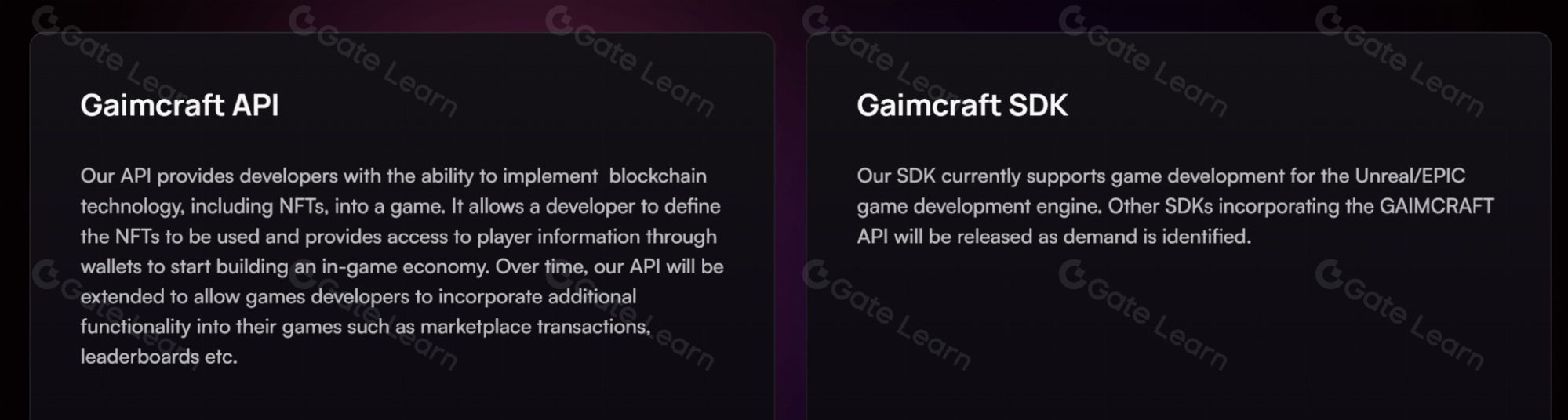 Gaimin 的 GAIMCRAFT 开发者工具为现有游戏添加 Web3 功能提供了强大的基础层。这些工具解决了游戏开发商面临的几个关键问题。GAIMCRAFT SDK 和 API 使开发人员能够快速轻松地将区块链技术(例如 NFT 和智能合约)集成到他们的游戏中。Gaimin 的沙盒(Sandbox,测试空间)允许游戏工作室与真实用户和职业电子竞技玩家测试他们的游戏,收集宝贵的反馈和改进建议。Gaimin 平台及其用户群为新游戏提供了理想的发布平台,确保开发商可以接触到热情的玩家群体,从而提升游戏成功率。