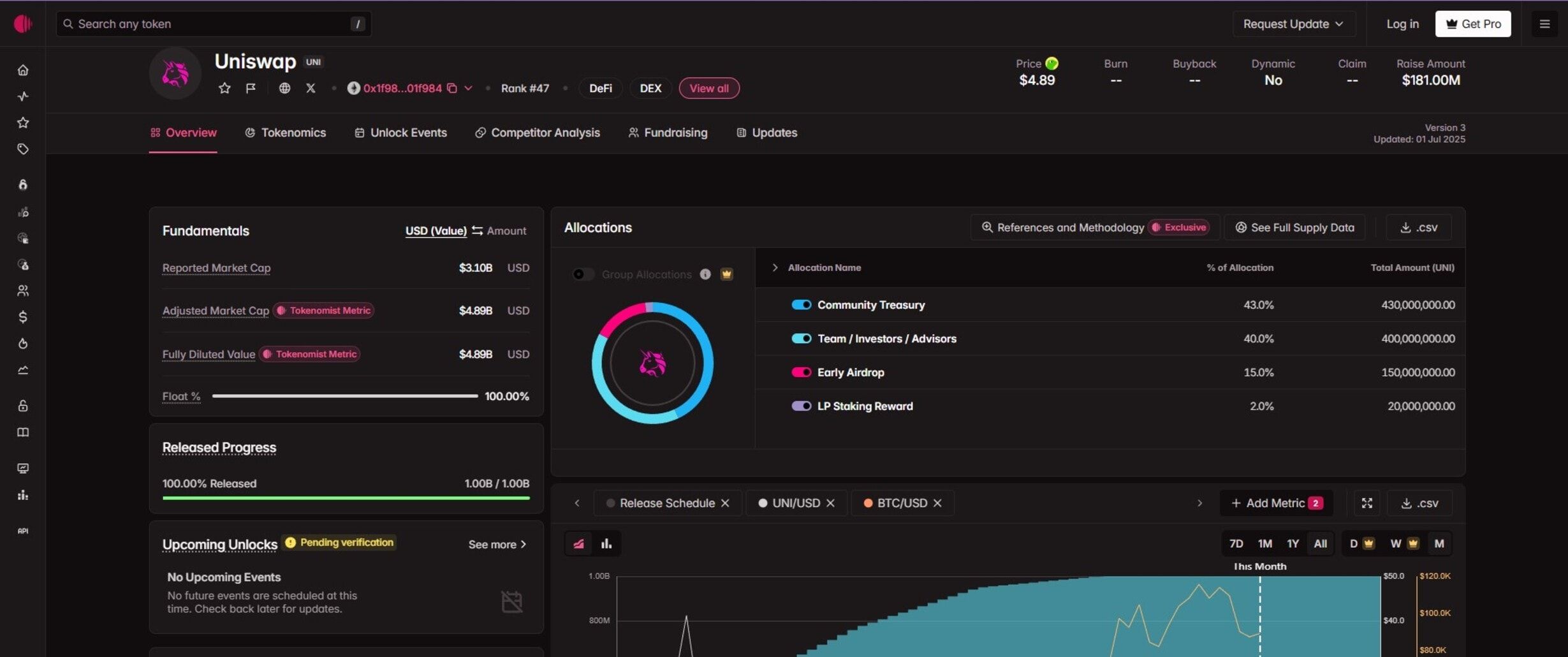 - 治理激励:UNI 持有者对升级、费用转换和国库(从 2026 年开始每年 2000 万 UNI 用于拨款)进行投票,没有像比特币/以太坊那样的质押奖励或减半。