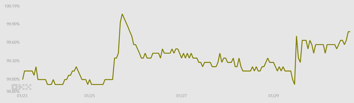 通常,稳定币的交易价格相对于美元/人民币汇率存在0.5%至1%的溢价。目前0.2%的折价表明资金流出程度适中,不过这较上周1%的折价有所改善。总体而言,比特币衍生品反映出一种谨慎情绪,此前14天内比特币价格下跌了13%。