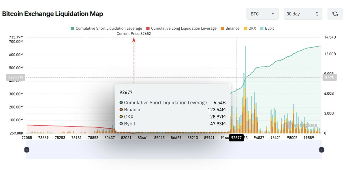 CoinGlass数据显示,若价格迈向92,000美元,累计超过65亿美元的空头头寸或将面临强制平仓风险。