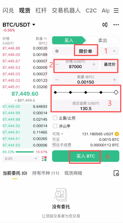 1、限价单(Limit):适合想低价抄底的人。例如当前价格8.7万,你设定8.7万买入,只有价格跌到该位置才会成交(需要等待)。