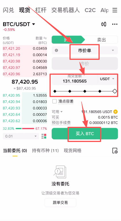 2、市价单(Market):适合急于买入的人。无需输入价格,直接输入购买金额,系统会以当前市场最优价格立即成交。 新手建议直接使用市价单,输入金额点击“买入BTC”,即可瞬间拥有你的人生的第一个比特币。