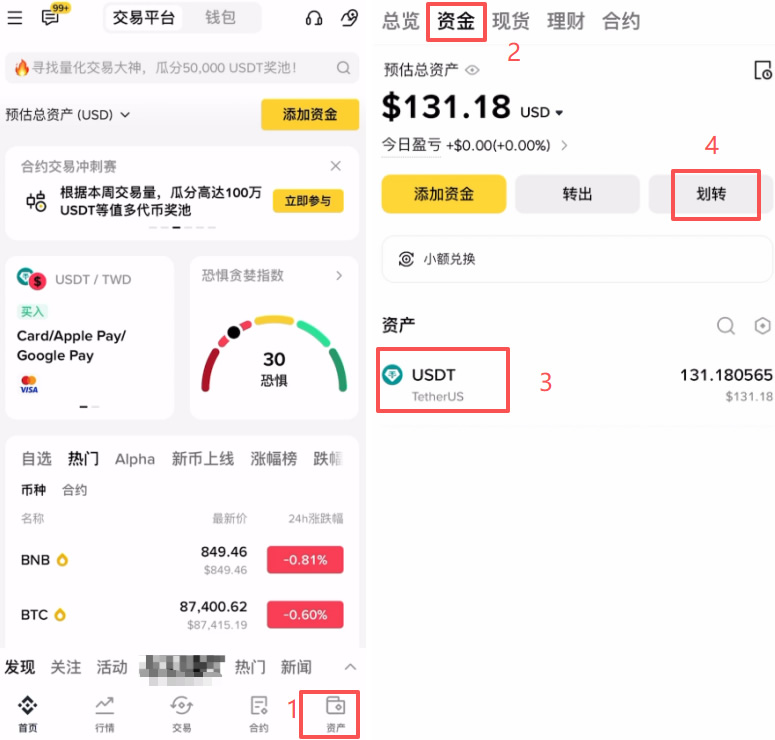 买到USDT后,资产默认在“资金账户”。要购买比特币,必须先进行划转。 点击右下角“资产” -> “划转”。