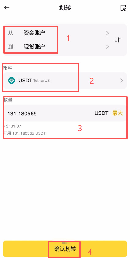 将USDT从“资金账户”划转到“现货账户”。这一步是免费且实时的。