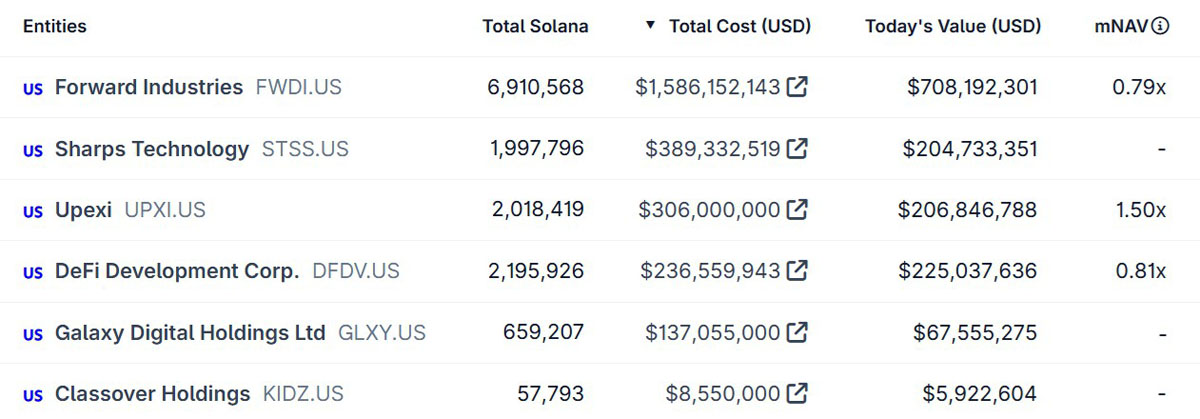 据CoinGlass数据显示,索拉纳现货交易所交易基金(ETF)周五净流出1100万美元。与此同时,以SOL作为企业储备策略的上市公司正面临压力。Forward Industries(FWDI美国)、Upexi(UPXI美国)和Sharps Technology(STSS美国)的股价较其各自净资产价值折让20%或以上。