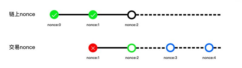以上图为例,链上需要一个nonce为2的交易,如果这个时候发出nonce为1的交易则立刻失败,同样,如果发出nonce为3或者4的交易,也立即失败。必须发出nonce为2的交易,才可以成功。 只要交易不发送到链上,交易就可以出现在交易队列里,等待后续执行。