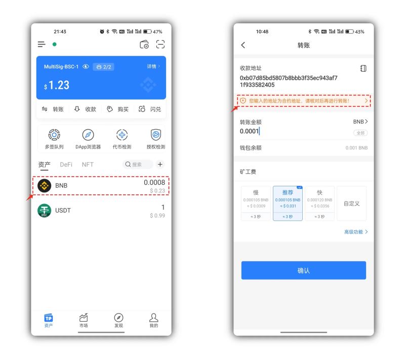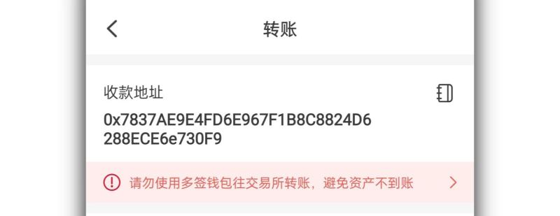 情况一:收款地址使用了多签钱包地址,在这里可以看到会有红色文字提示转入的为合约地址,请谨慎操作。