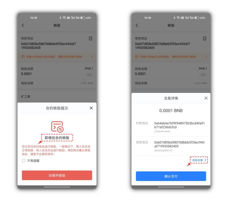 2、TokenPocket内置了合约地址检测功能,所以在这里还会看到一层安全提示内容,再确认安全后点击知晓并继续。接下来跳转到了交易界面中,在这里有一个高级设置它是用户自定义nonce值的作用。