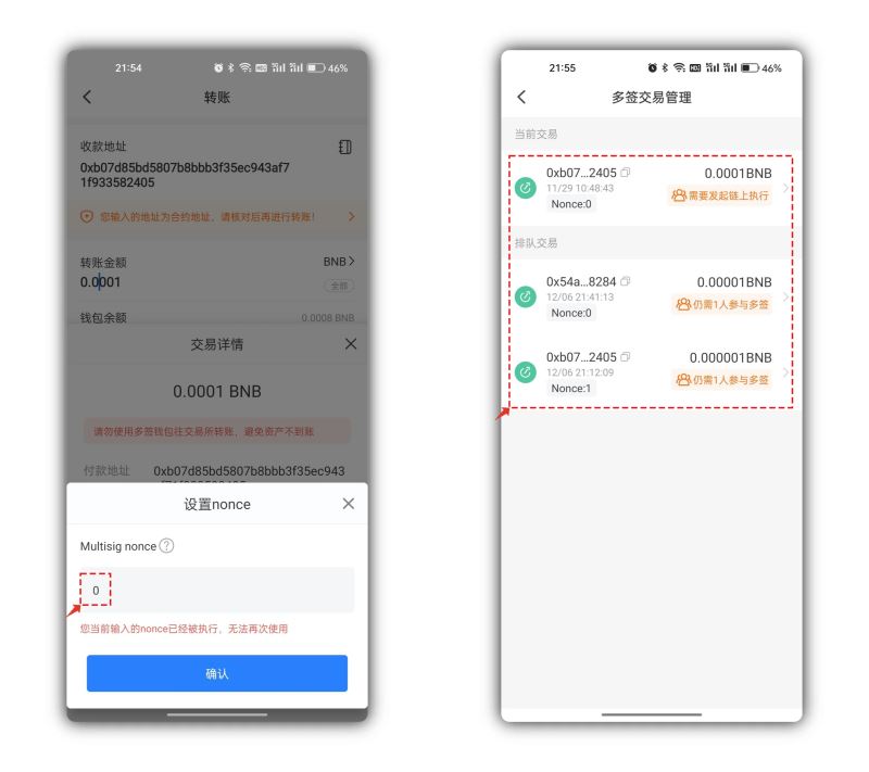 需要注意的是,在创建多签交易时,必须确保交易的Nonce与多签合约预期的顺序一致。如果一个交易的Nonce与预期的值不匹配,交易将在链上执行时直接报错并失败。因此,在同时发出多笔多签交易时,需要按照顺序,将交易的Nonce值从小到大进行执行。只有当发出的交易的Nonce与当前预期的Nonce值匹配时,交易才能成功执行。