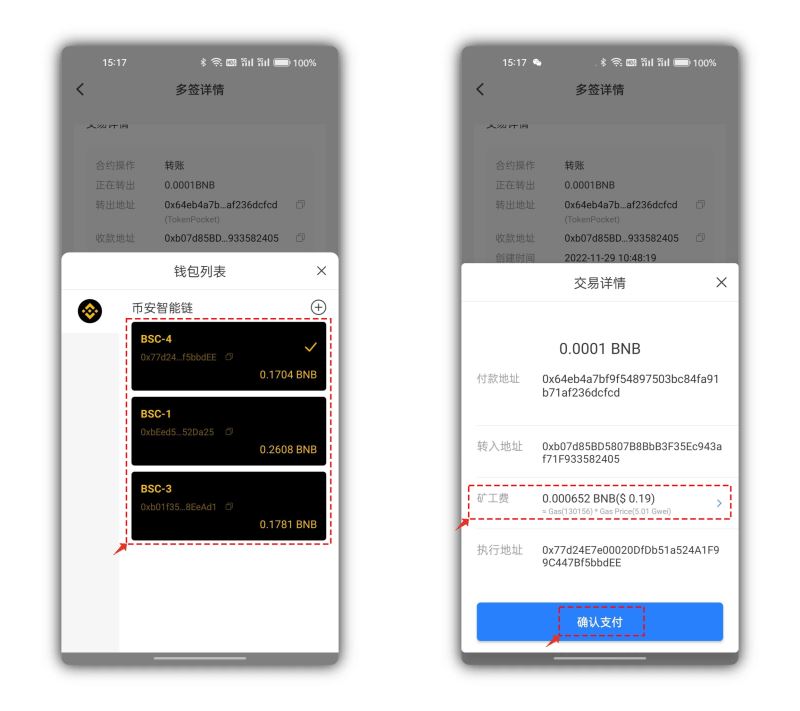 4、完成所有的签名后,最后的上链过程中会调用钱包中已经导入的bsc钱包列表任选一个有足够Gas(矿工费)的地址进行上链费用的支付,同样可以在交易详情中来自定义Gas费用,点击确认支付并输入密码后即可完成多签钱包转账的所有执行操作。