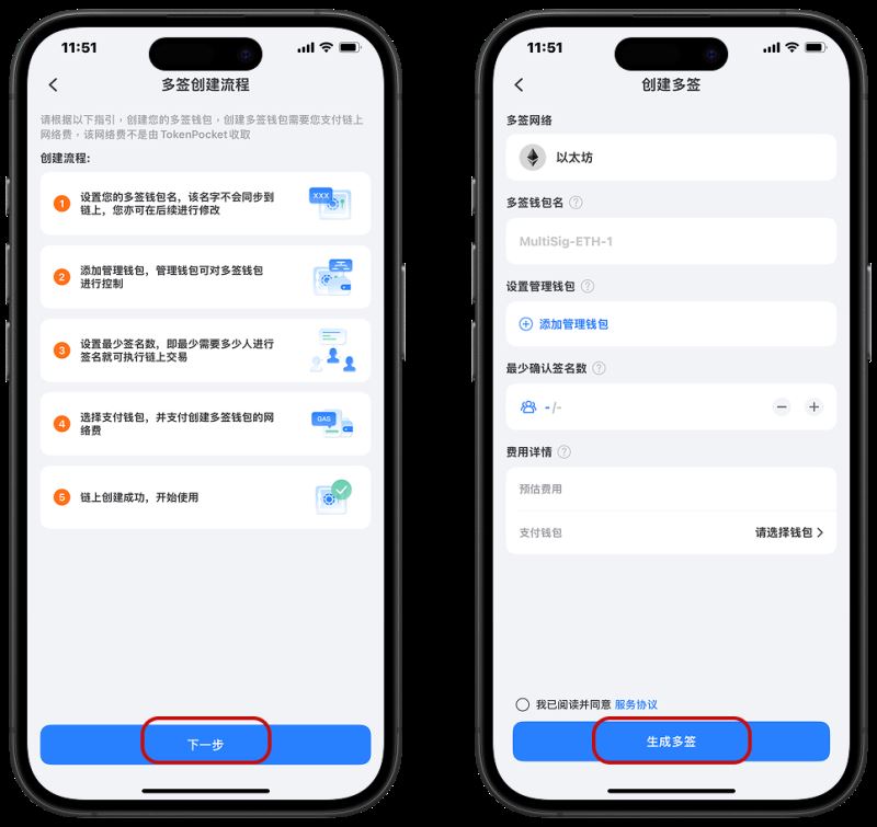 1。 - 费用详情:基于 EVM 的链的多重签名方案是一个智能合约,因此创建多重签名钱包需要支付 Gas(矿工费),而 TokenPocket 不收取此费用。