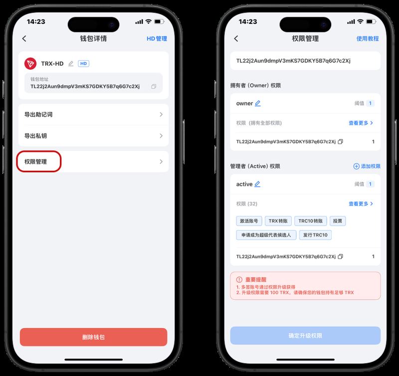 如果您想在 TRON 链上创建多重签名钱包,您可以通过升级现有 TRON 钱包的权限来快速设置,也可以通过添加新钱包来创建。以下演示了通过升级权限快速创建钱包的过程。