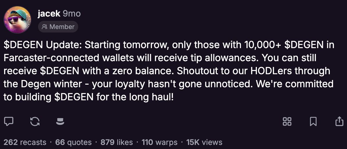 这里需要做一个提醒,Jacek在社区发布第二轮空投 公告后,社区成员踊跃参与,但也吸引了一些垃圾信息者。为解决该问题,第二轮空投要求用户持有至少10,000枚DEGEN代币才能获得打赏额度。