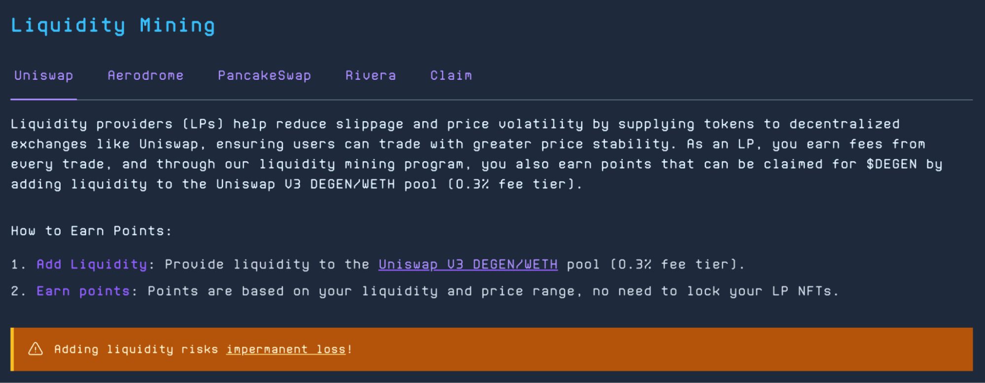 除了三轮空投,创世供应量的10%还用于流动性挖矿奖励。用户可以通过为Uniswap V3 DEGEN/WETH 池提供流动性来参与。除了作为 LP的手续费外,用户还可以根据提供的流动性数量以及与当前价格范围的匹配程度来赚取积分,以兑换DEGEN奖励。