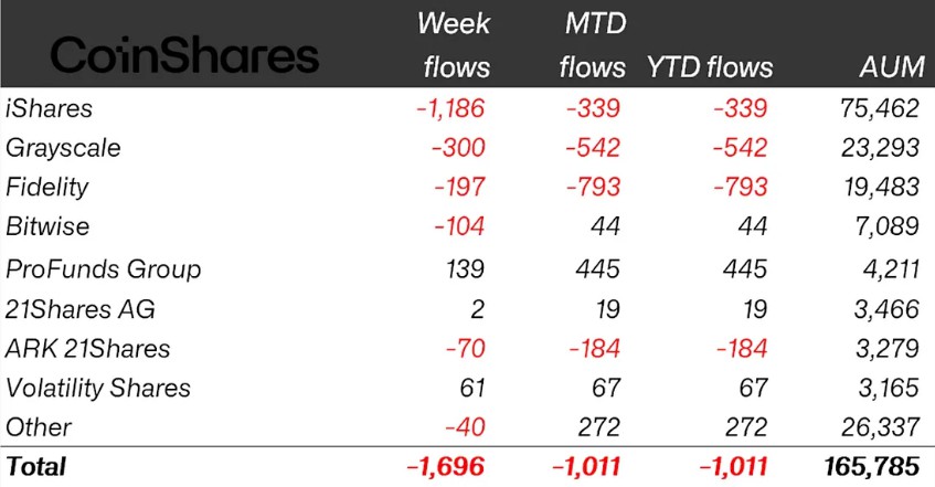 CoinShares 数据分析,加密货币基金连续第二周出现资金流出,规模达17亿美元
