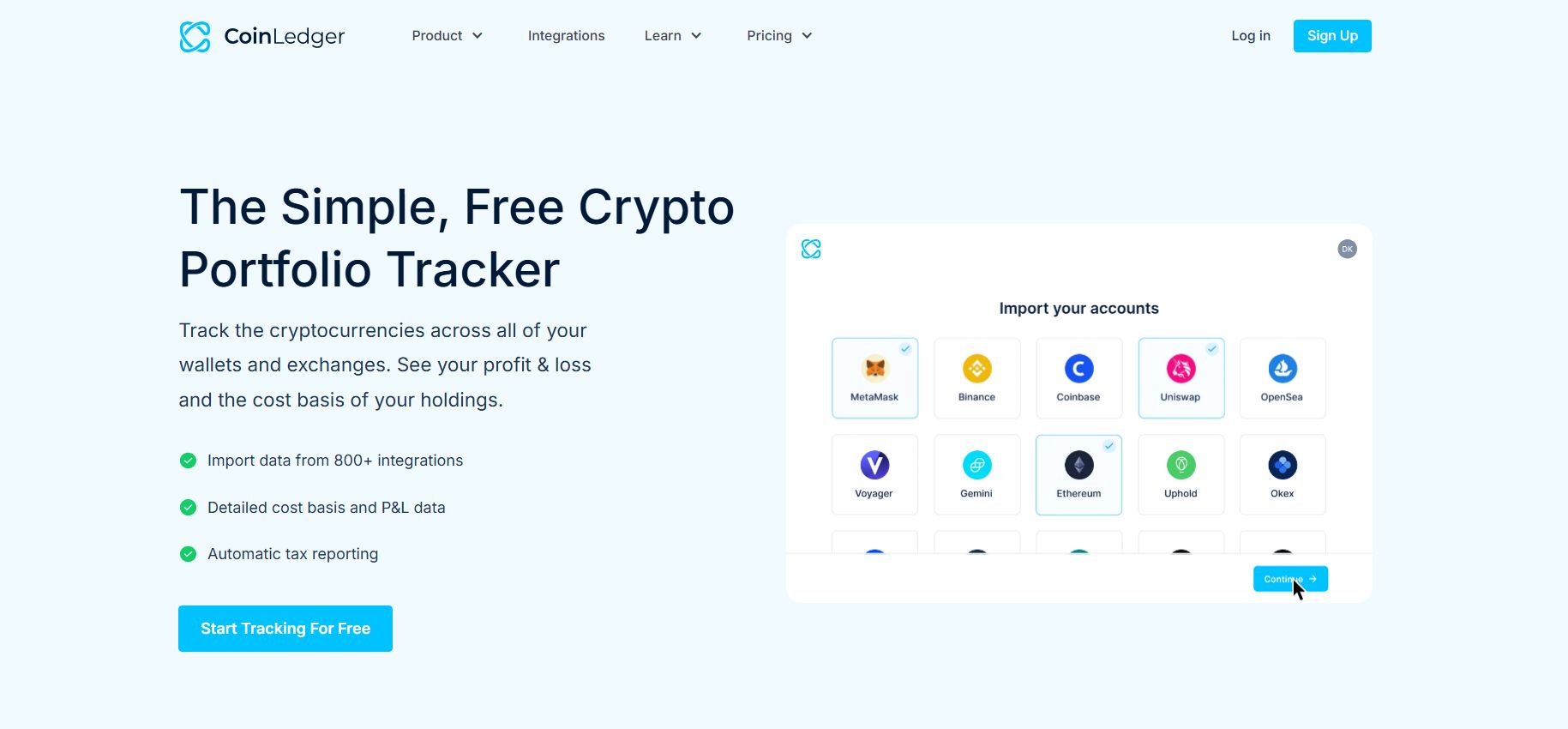 CoinLedger 凭借其卓越的加密货币钱包追踪功能脱颖而出,成为全球超过 50 万用户的首选。我们喜欢它的原因在于,它将投资组合追踪和税 务报告集成在一个简洁易用的平台。只需几分钟,即可连接交易所、钱包和区块链,无需手动操作即可清晰了解您的数字资产。无论您是加密货币新手还是经验丰富的管理者,CoinLedger 都能完美胜任。