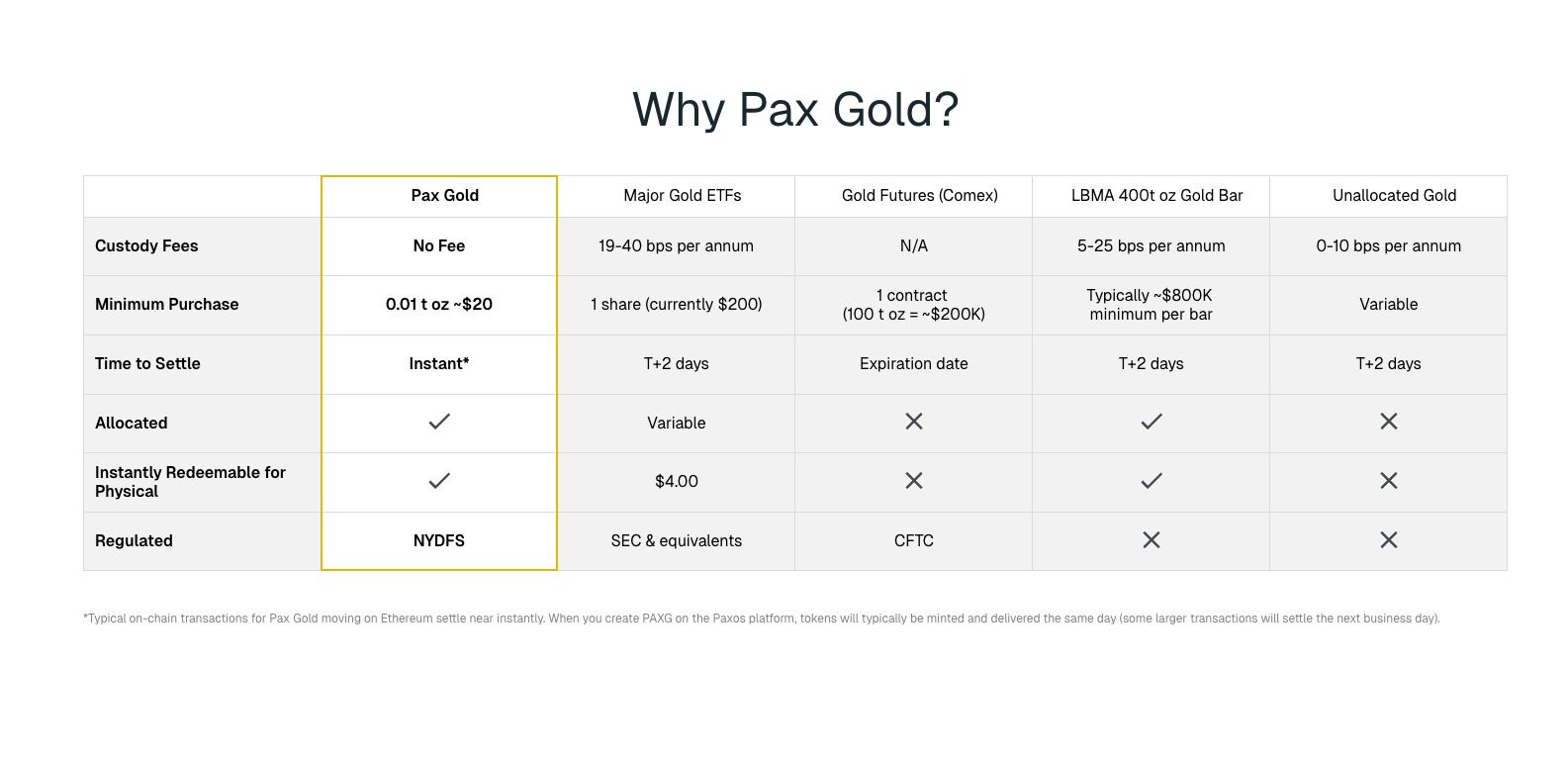 PAX Gold 由 Paxos 于 2019 年 9 月推出,Paxos 是 Paxos Standard (PAX) 和其他受监管数字资产产品背后的同一家公司。Paxos 作为一家受纽约监管的信托公司和托管人运营,将支持每个 PAXG 代币的基础黄金保存在独立账户中。