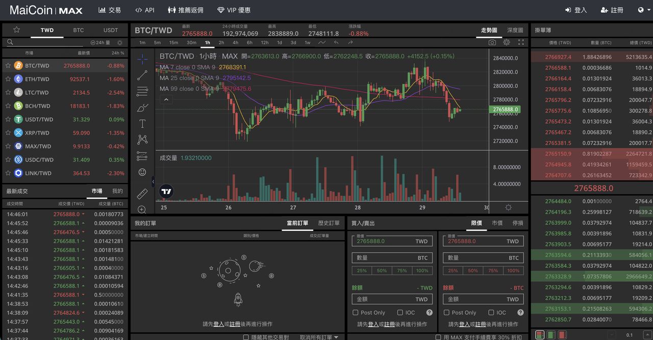 在 USDT 的购买与交易深度方面,MAX 提供 USDT/TWD 现货交易对,支持银行转帐入金后直接下单购买 USDT。由于平台用户以台湾本地资金为主,USDT/TWD 的流动性在一般金额范围内具有可用深度,但在大额交易时,汇率通常会出现约 0.5%–1% 的溢价,反映本地市场供需结构与流动性规模的限制。交易手续费采用分级制度,约为 0.05%(Maker)至 0.15%(Taker),使用平台币 MAX Token 可享有额外费率折扣,整体费率结构清楚透明。