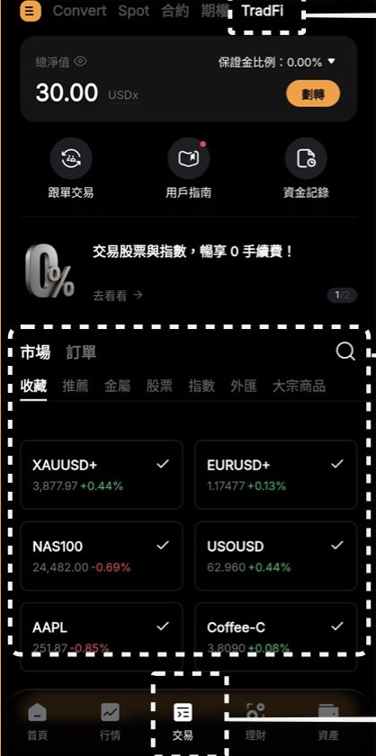 举凡股票、指数、外汇、大宗商品等,都能通过同一个界面来使用,如果同时有投资加密货币,也可像平常划转资金到不同帐户一样,快速将资金放进TradFi 帐户来交易,减少界面适应的时间。