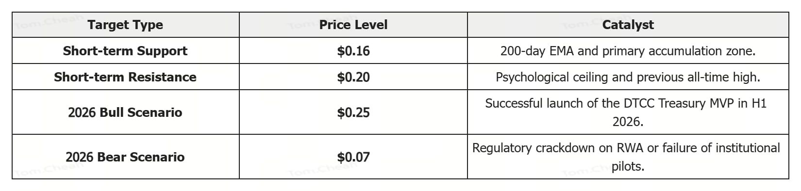 技术前景表明,如果CC能守住0.169美元,它有望在第一季度末挑战0.25美元。2026年的长期预测显示,如果DTCC试点项目扩展到主要ETF,潜在峰值可能达到0.52美元。