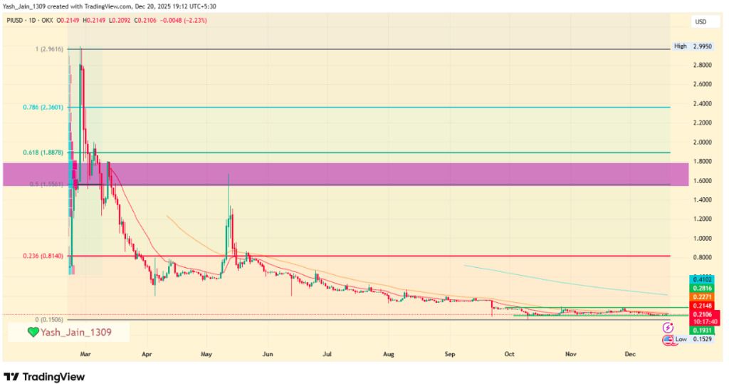 Pi Coin 的价格目前在 0.19 美元至 0.28 美元之间横盘整理。然而,对 2026 年的预测表明,如果关键发展促进其普及,则有可能出现复苏。