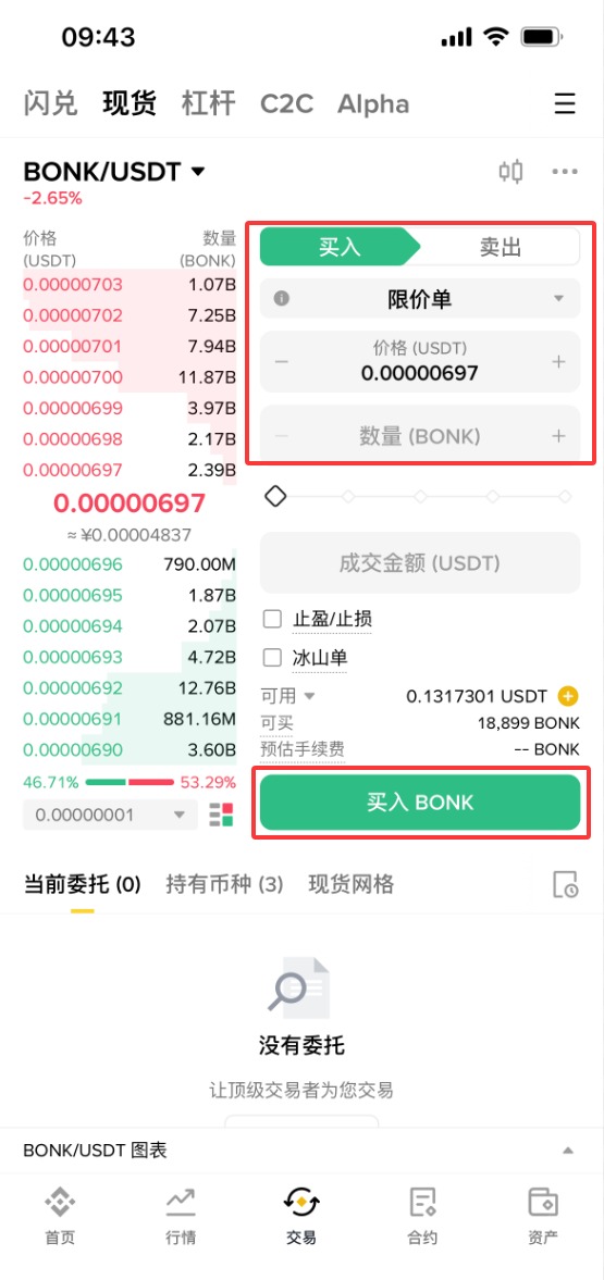5、依次选择【限价单】-购买【价格】-购买【数量】-【成交数量】,设置好之后,点击【买入BONK】。