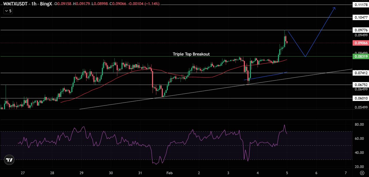 • 当前交易价格: WMTX 的交易价格接近 0.091 美元,最近突破了 0.083 美元的局部盘整底部。