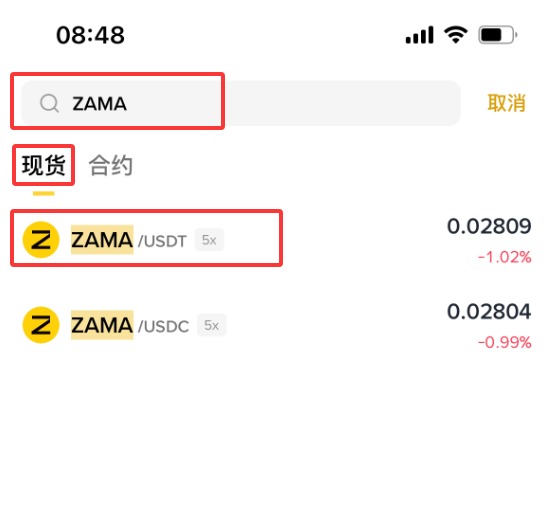 3、输入【ZAMA】,这时下拉会显示【现货】【ZAMA/ USDT】,点击【ZAMA/ USDT】。(作为新手,不建议做合约,所以这里就不演示合约购买方式了。)