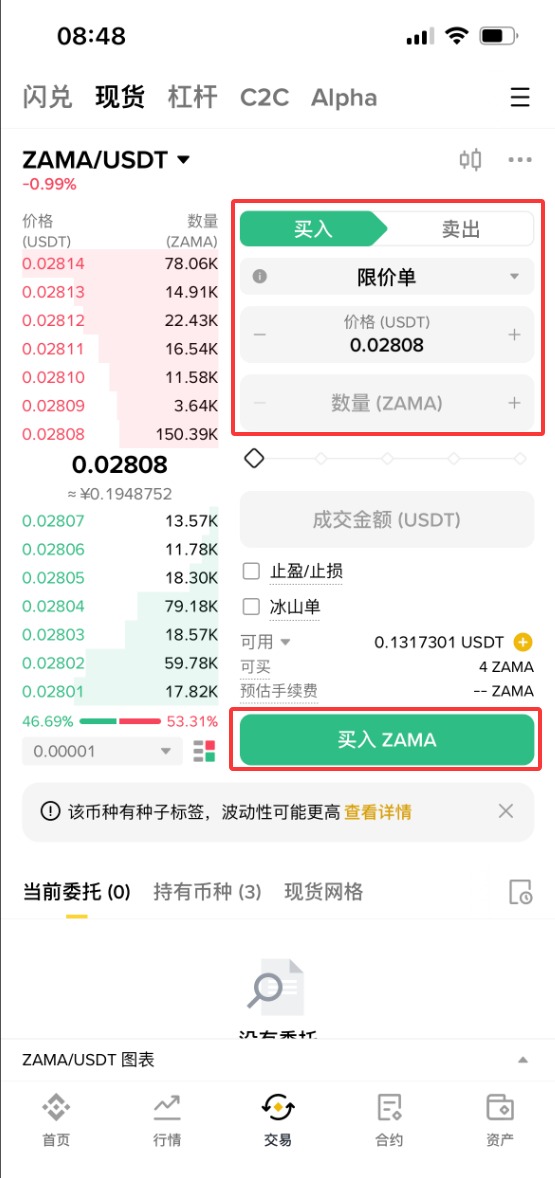 5、依次选择【限价单】-购买【价格】-购买【数量】-【成交数量】,设置好之后,点击【买入ZAMA】。