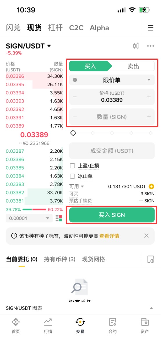 5、依次选择【限价单】-购买【价格】-购买【数量】-【成交数量】,设置好之后,点击【买入SIGN】。