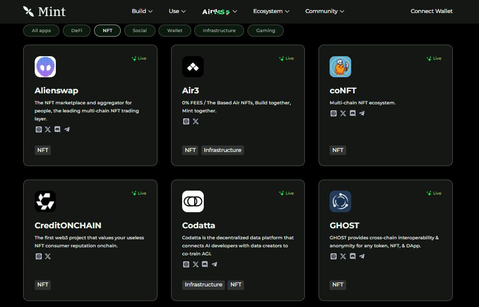 - MintSwap:Mint 区块链上的去中心化交易所(DEX)和 NFT 交易市场,提供代币兑换、NFT 交易和 NFT 金融服务。