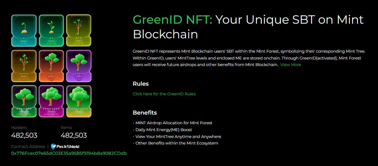 GreenID NFT 仅面向 Mint Forest 订阅用户。这种 NFT 是不可转让的 [也称为灵魂绑定代币 (SBT)],代表着 Mint 用户在 Mint Forest 中的树木,可以通过 Mint 能量 (ME) 在链上升级。通过激活 GreenID,Mint Forest 用户将获得来自 Mint 区块链的未来空投和其他福利,如 Mint Forest 参与者的 MINT 空投分配、每日 Mint 能量 (ME) 提升、随时查看 MintTree 状态的能力,以及 Mint 生态系统内的其他特权。要获得这些福利,Mint Forest 用户必须激活 GreenID NFT。激活步骤如下: