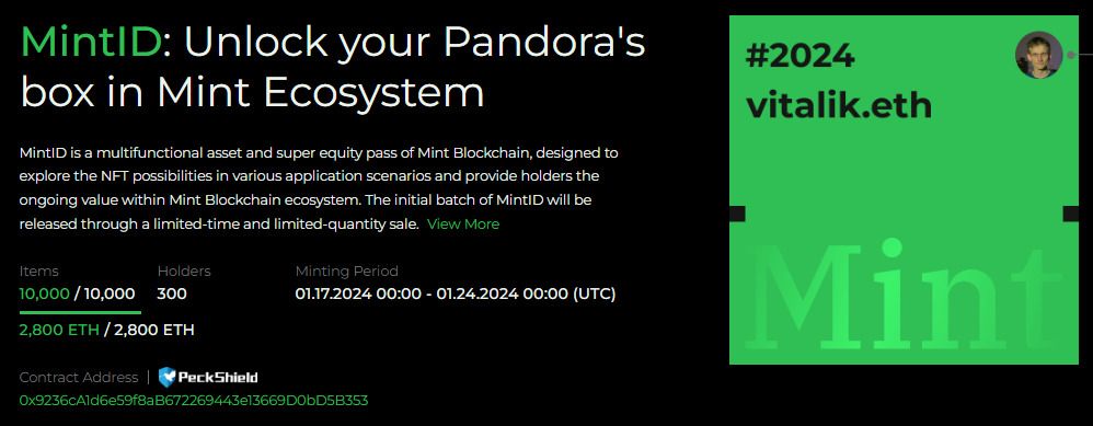 MintID 是进入 Mint 区块链的通行证。它是 Mint 区块链生态系统内的多功能资产和超级权益通行证,旨在探索 NFT 在各种应用场景中的可能性,并为持有者提供持续价值。该 NFT 总供应量为 10,000 个,铸造价格为 0.28 ETH,具有以下几项权益: