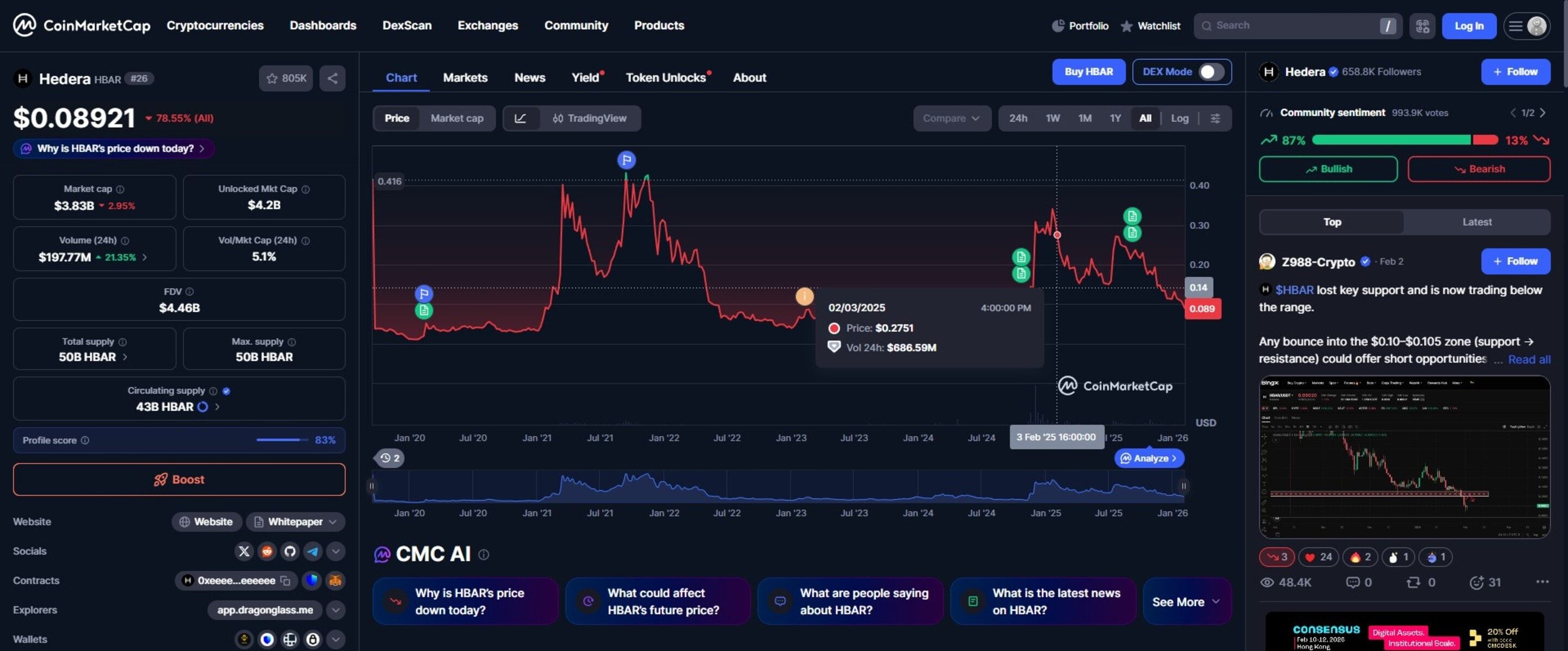 HBAR 目前交易价格约为0.09 美元,反映了山寨币持续的波动以及加密货币市场的整体疲软。该代币的走势与整体避险趋势一致,而非展现出独特的强势。HBAR的最大供应量为 500 亿枚,目前约有 430 亿枚(86%)在流通,市值约为 39 亿美元。交易量保持在 1.5 亿至 1.7 亿美元的健康水平,表明各交易所的流动性活跃。