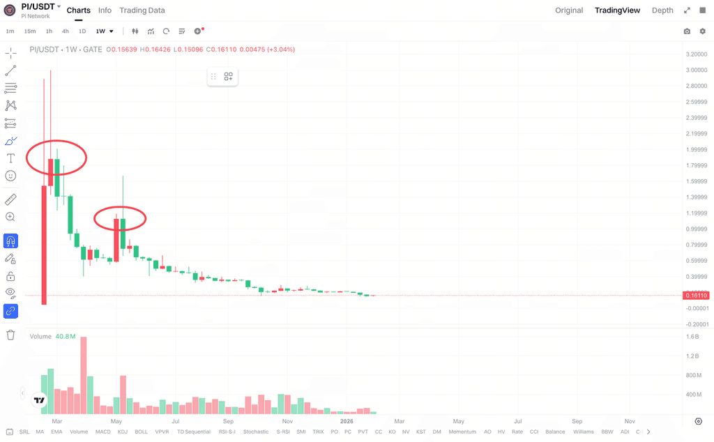 从时间维度来看,PI 币的价格低迷并非单一事件触发,而是多个阶段性因素叠加后的结果。