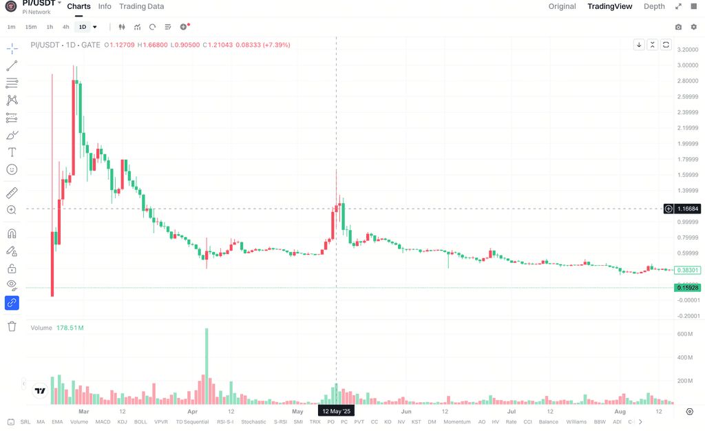 此后,PI 币价格开始回落,并在 2025 年 4 月一度跌至约 0.4 美元附近。尽管在 5 月初出现过一轮反弹行情,价格曾短暂回升至 1.6 美元上方,但整体趋势并未发生根本改变。自 2025 年 5 月中旬以来,PI 币价格持续走低,目前已跌破 0.2 美元,且尚未形成明显的价格支撑区域。