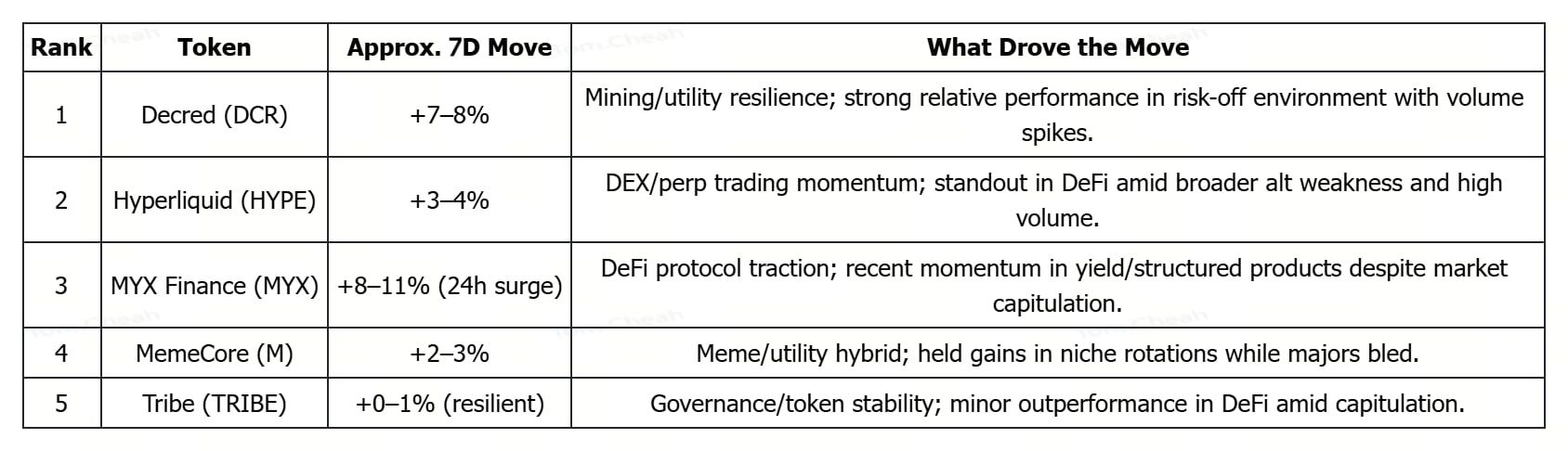 在市值至少 10 亿美元、具流动性且受市场广泛关注的代币中,在 2026 年 1 月 30 日至 2 月 6 日期间,随着整体市场急跌、BTC 下探至 62,800–64,800 美元区间(单周跌幅明显)、ETH 接近 1,900 美元、极度恐慌情绪笼罩,资金有选择性地轮动至 DeFi、跨链互通及收益型标的,部分代币表现相对抗跌。