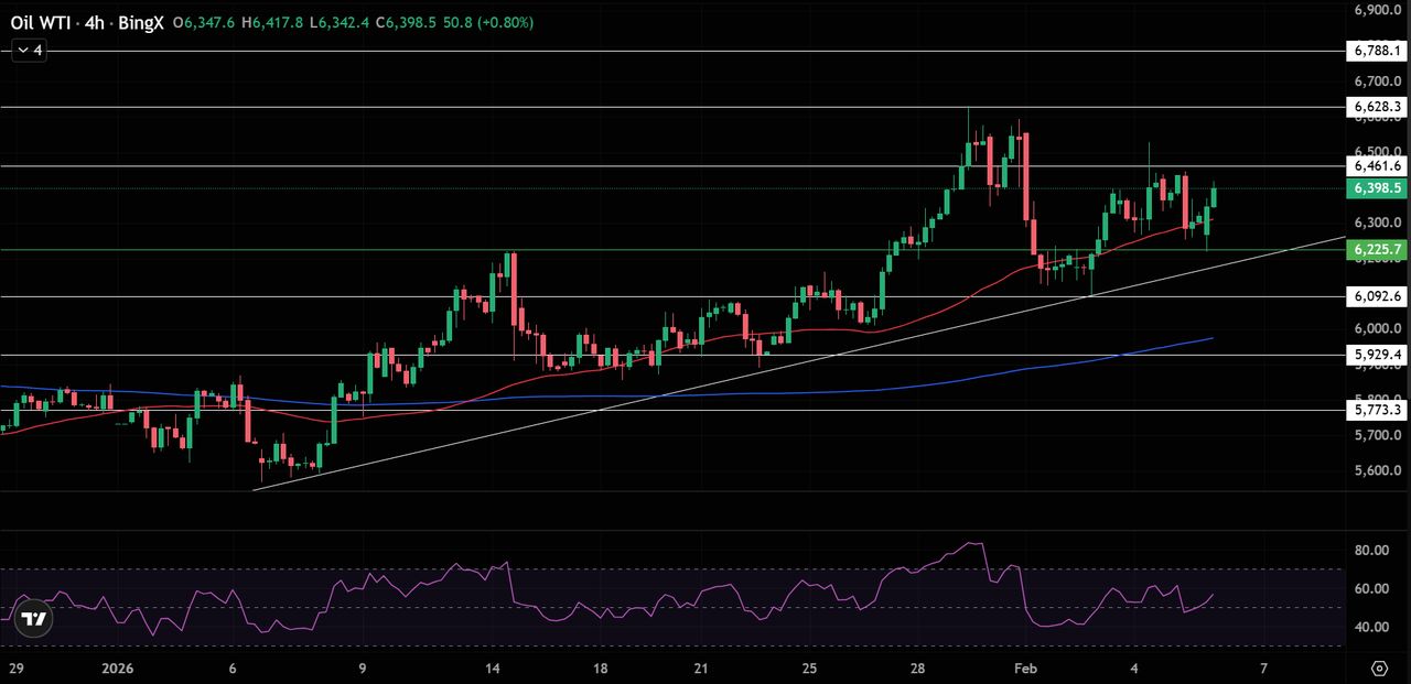 WTI 原油(USOIL)在 4 小时图上自 62.20–62.50 美元支撑区反弹后,现交投于约 63.80–64.00 美元。近期 K 线呈现擡高低点且实体缩小,反映为整理格局,而非新一轮抛售。价格仍沿着自 1 月初以来的上升趋势线运行,短线结构保持正面。