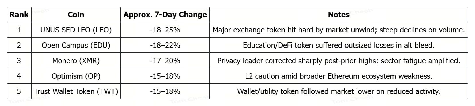 在大市值及中高市值(市值 ≥ 10 亿美元)代币中,本周跌势反映整体市场的投降式抛售、风险资产撤出、巨额强平以及在恐慌情绪与宏观压力之下 BTC/ETH 的技术破位。