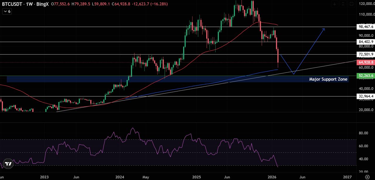 比特币周线拆解:65,000 美元失守,长期趋势线受压
