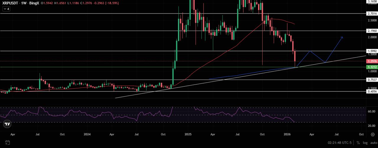 XRP 周线拆解:1.30 美元失守,长期趋势线面临考验