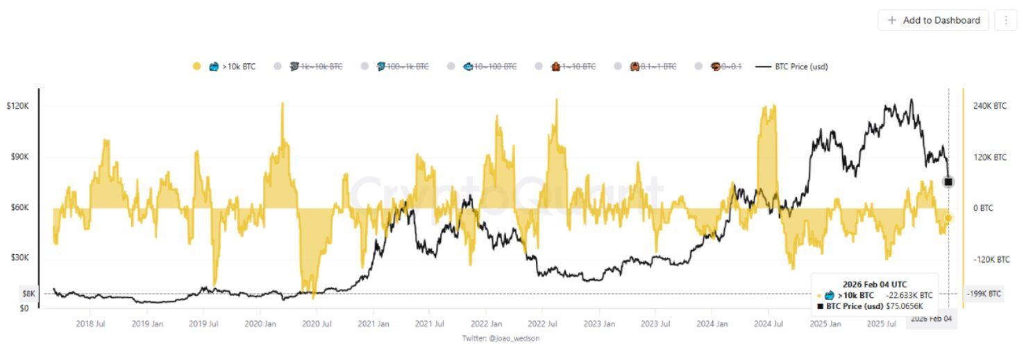 持有 1 万枚比特币的巨鲸仍在进行比特币分配。——来源:CryptoQuant