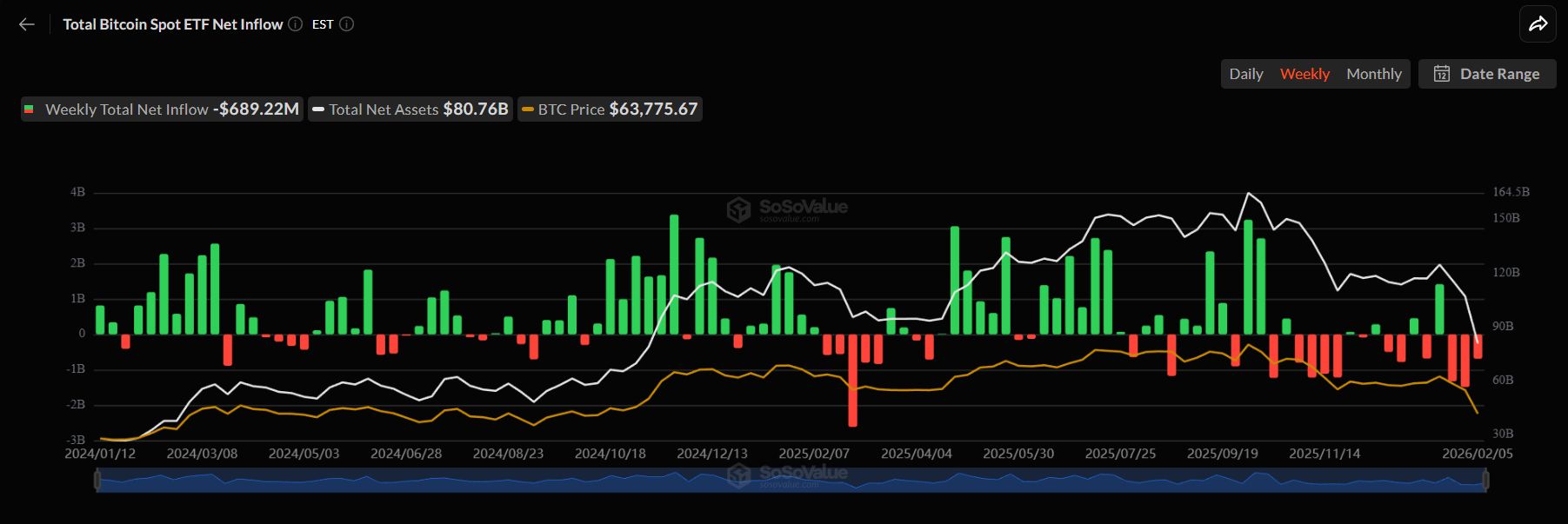 过去三周,比特币ETF分别遭遇了13.3亿美元、14.9亿美元和约7亿美元的净流出。数据显示,避险情绪弥漫的宏观环境迫使即使是最老练的投资者也减少了比特币的持仓,从而加速了下跌趋势。