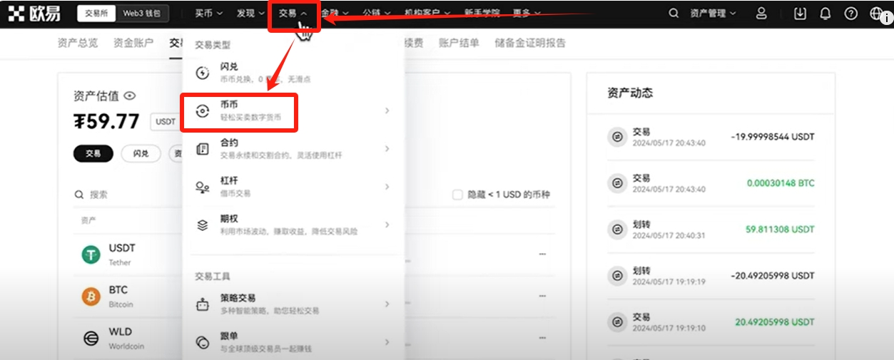 提现也很简单,我们还是回到刚才的交易界面,点击【交易】,选择【币币】。