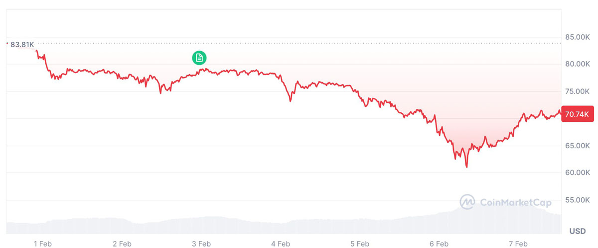 据CoinMarketCap报道,这一涨幅出现之际,比特币从2月1日的约81,500美元,在短短五天内跌至约60,000美元,随后在发布时回升至70,740美元。