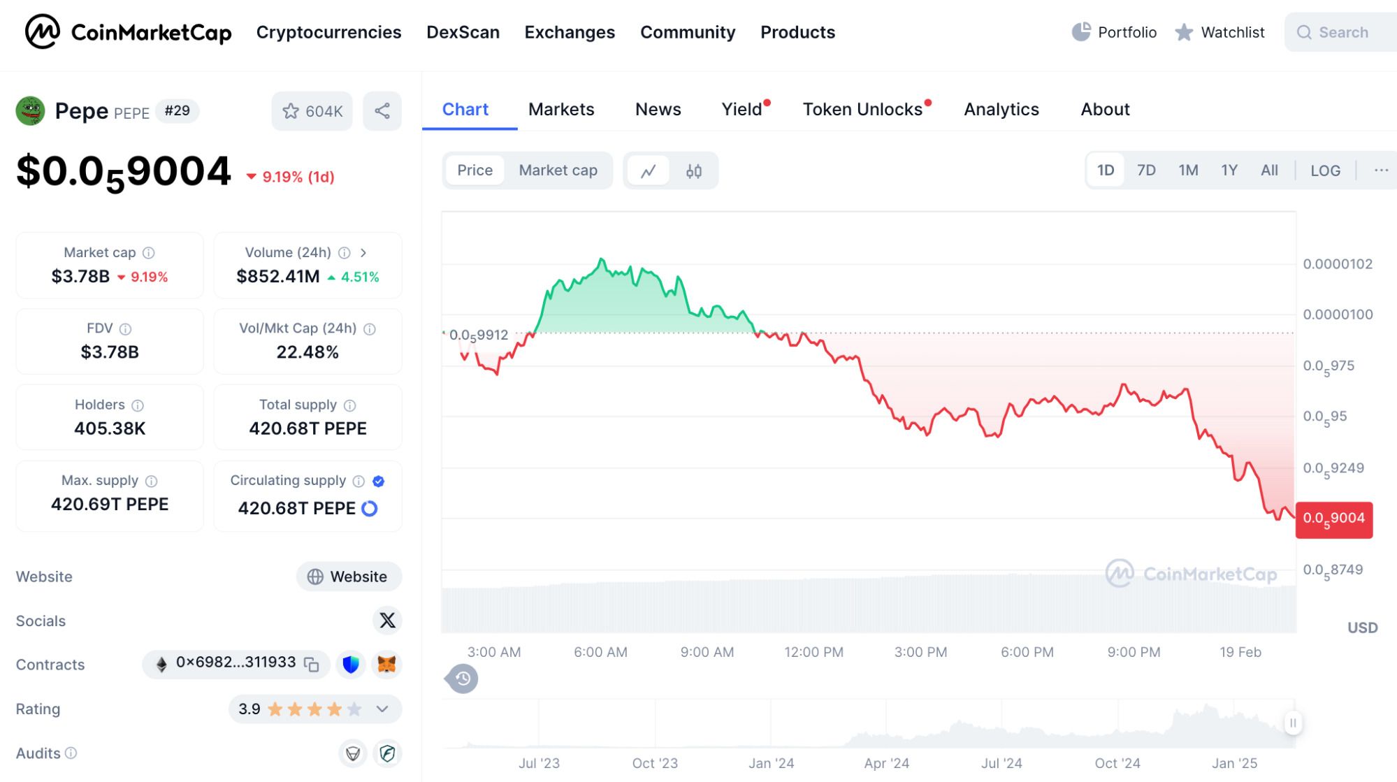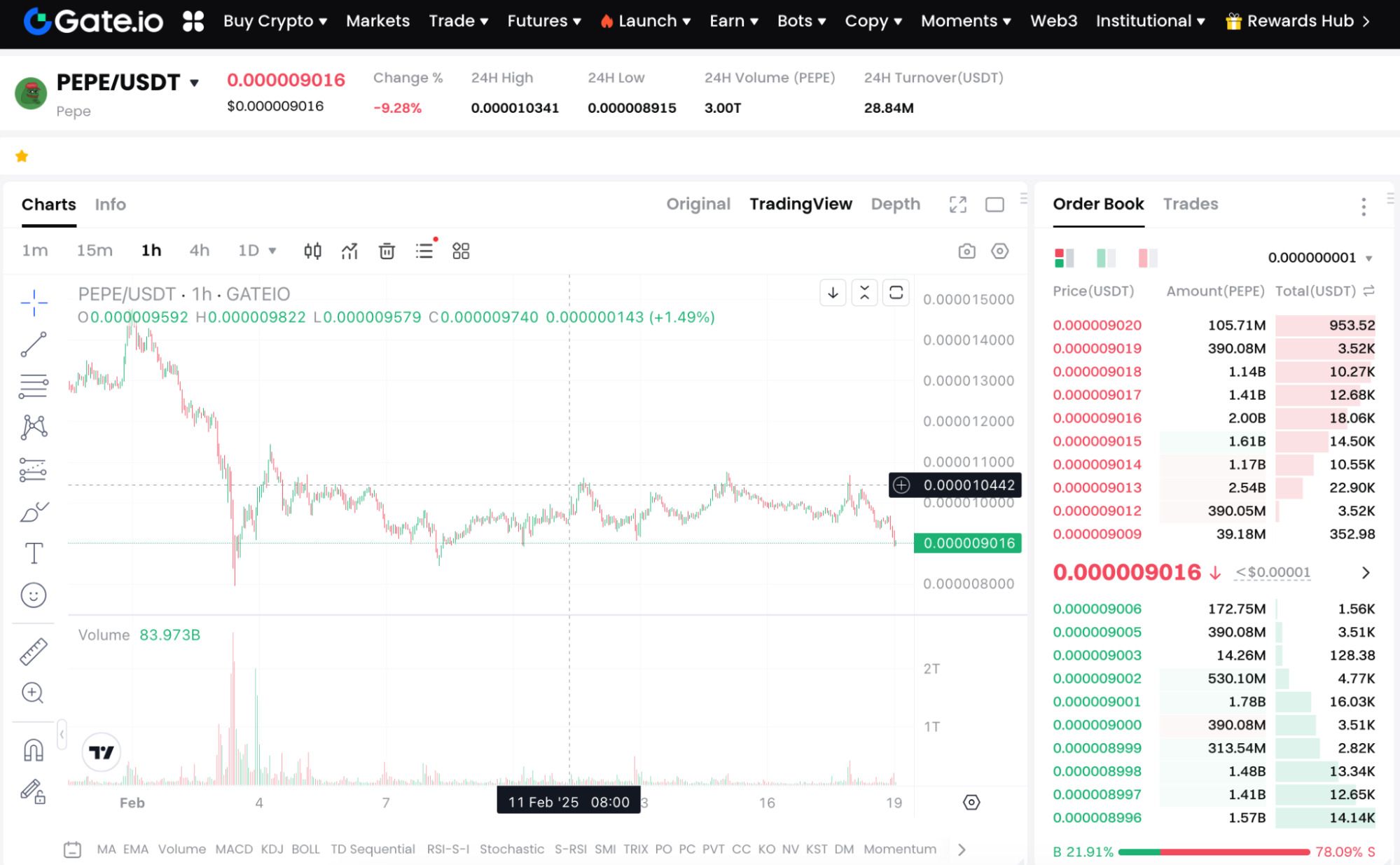 截至2025年2月19日,PEPE 币在 Gate.com 的实时数据如下: