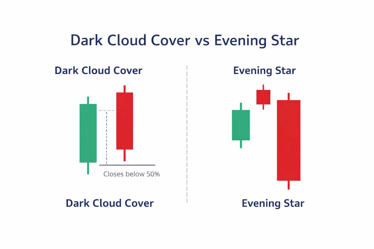 乌云盖顶经常与其他看跌反转形态混淆,但差异很重要,因为它们标志着市场弱势的不同阶段。