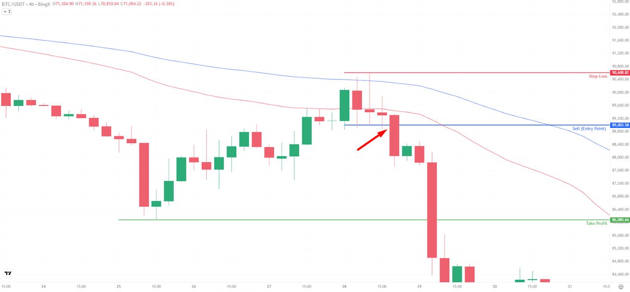 入场逻辑:交易者没有立即卖出,而是等待确认。入场在价格跌破89,000美元附近支撑后触发,与以下因素一致: