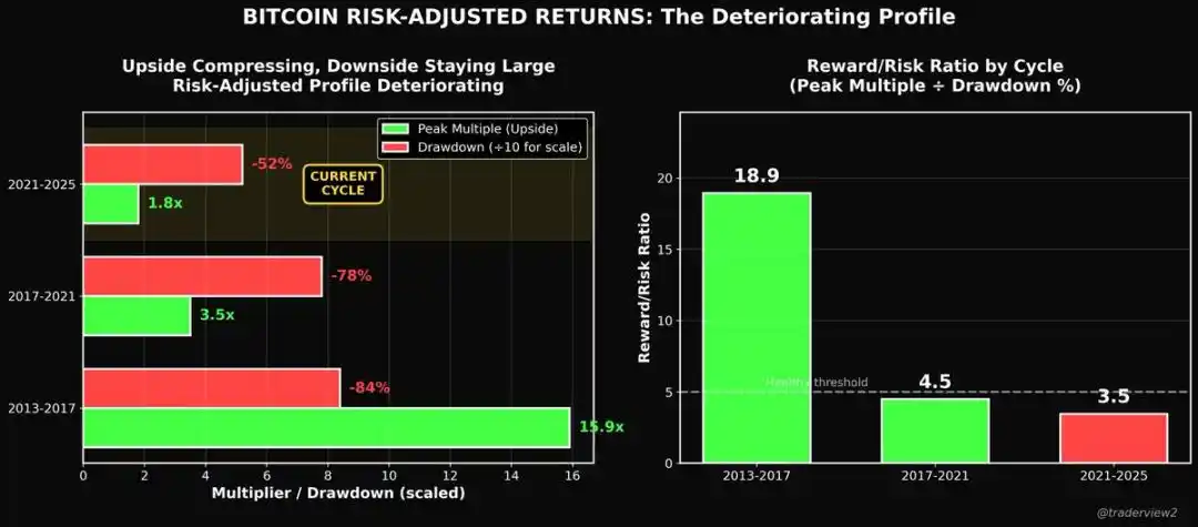 这就是当前的核心矛盾:比特币的收益空间已大幅压缩,但波动率却未同步下降。依旧是剧烈波动的行情,顶点涨幅却大幅缩水,这样的周期模式根本无法持续。